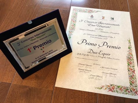 9/9〜13にイタリアのサンタ・ヴィットリア・イン・マテナーノで開催された「3°Concorso Internazionale “Duo Hayashi”」にて、清岡優子(Vn)&大野真由子(Pf)のDuo Espoirが優勝いたしました!
